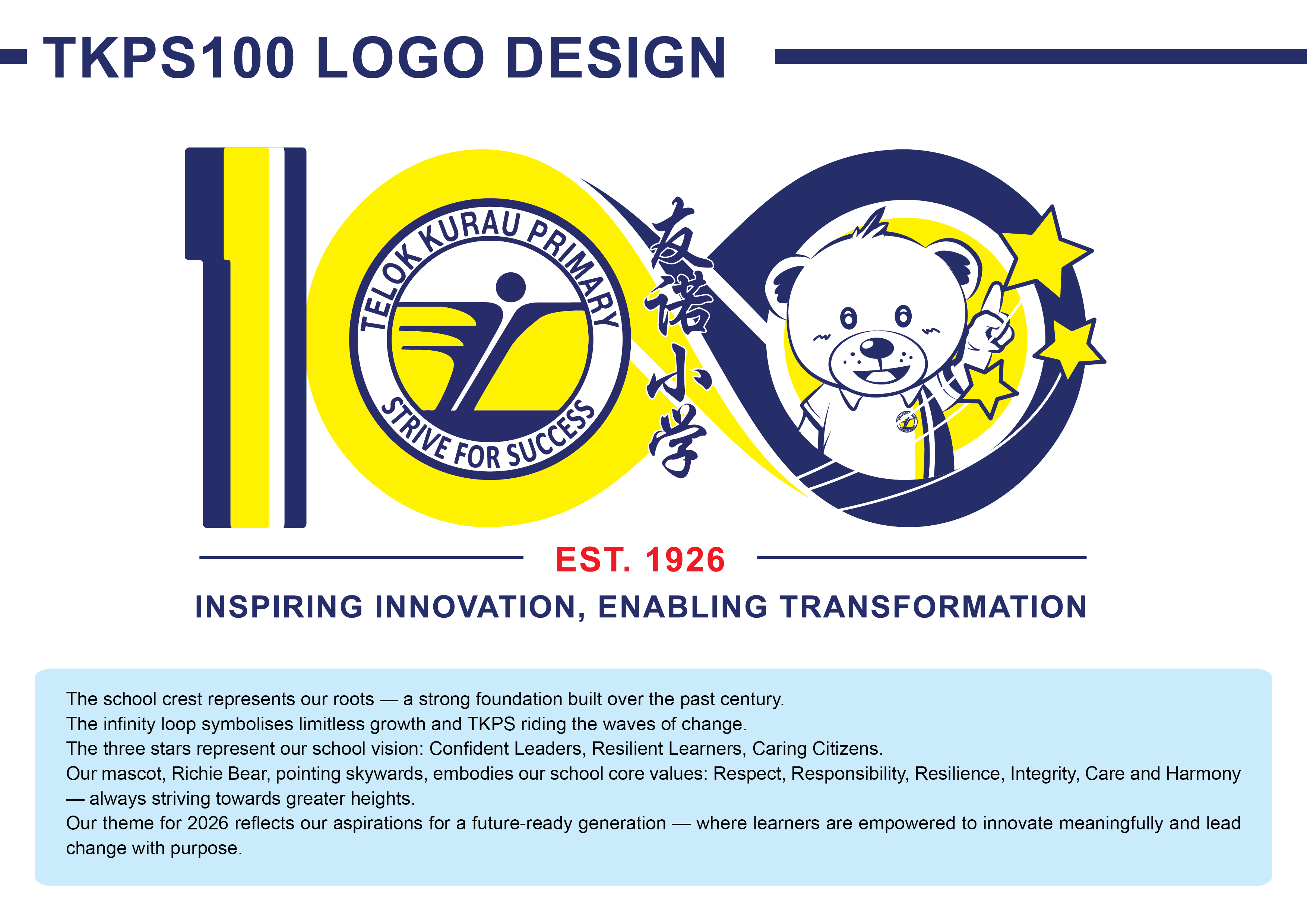 As Telok Kurau Primary School commemorates its 100th anniversary, we are proud to unveil the TKPS100 logo — a meaningful emblem that reflects our rich heritage, shared values and forward-looking aspirations.
